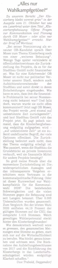 Leserbrief: Was spricht FÜR die Klosterberg-Bebauung?