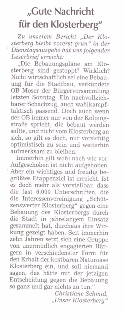Allgemein Gute Nachricht für den Klosterberg von Vier Klosterbergvier24. Oktober 202527. Oktober 2025 Donau-Anzeiger, 24.10.2025